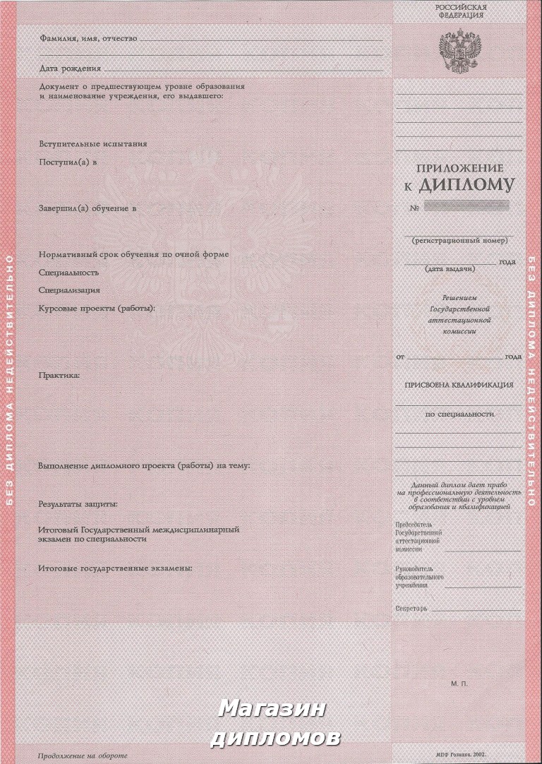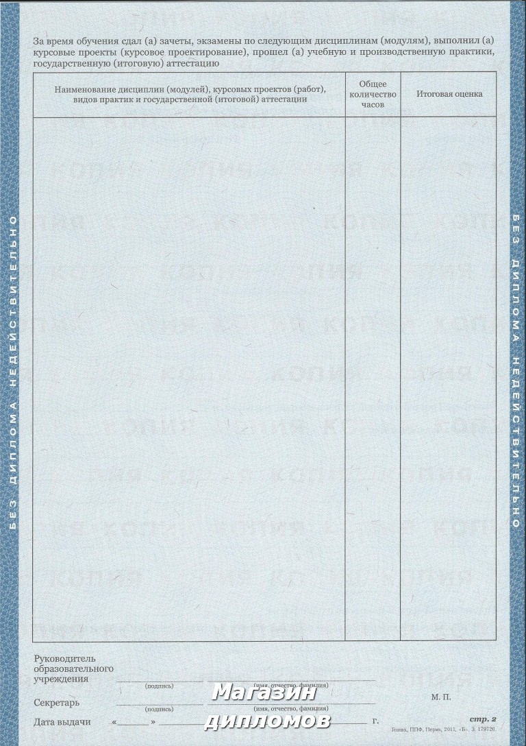 Диплом, это официальный документ, к которому выдвигаются соответствующие требования. Он должен быть заполнен только на бланке государственного образца фабрики ГОЗНАК, на котором в обязательном порядке присутствуют строго установленные средства защиты от подделок: водяные знаки, микрошрифт, светящиеся при ультрафиолете волокна и индивидуальный номер.